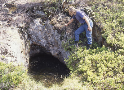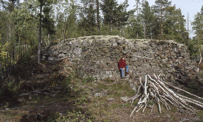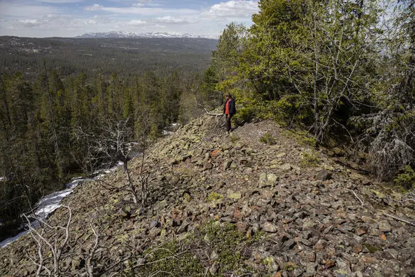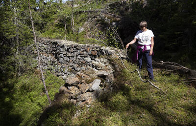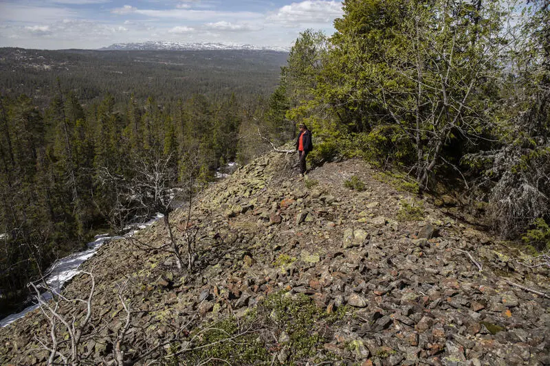 Et av Lindbu-skjerpene ved Nordre Valders, Vinorens første sølvfunn i 1663 av overstiger Erich Hackner. På kollen bak er en samtidig inskripsjon innhogd i berget. - 13/18