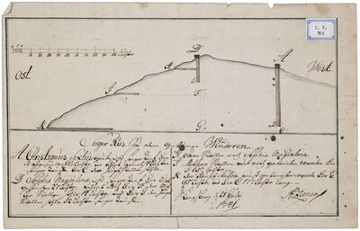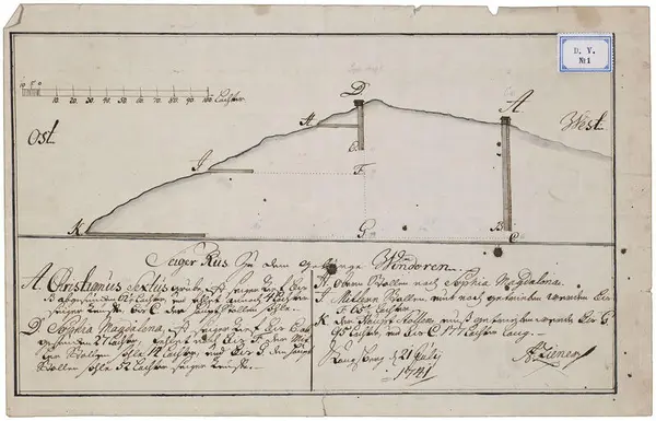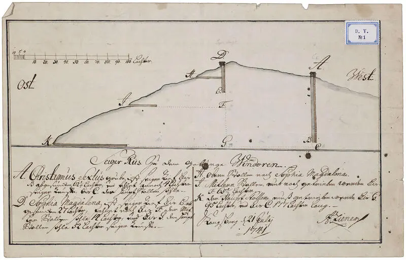 Vertikalsnitt øst–vest gjennom Dronningkollen 1741 viser skjematisk framstilt sjaktene til (A) Christianus Sextus og (D) Dronning Sophie Magdalene gruver. Fra vestsiden er det allerede drevet en dagstoll gjennom til den sistnevnte, mens to er påbegynt: Mellomstollen og Hovedstollen, den siste planlagt og senere gjennomdrevet 860 m til Christianus Sextus. Ingen stoller er inntegnet fra vest, men det er drevet to stoller til gruva herifra også. (Riksarkivet KS II D V 1, A. Ziener) - 16/18