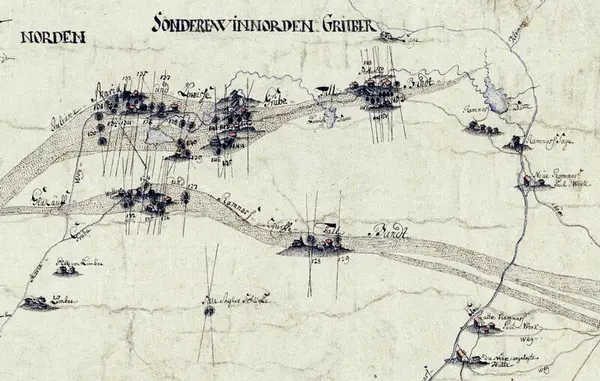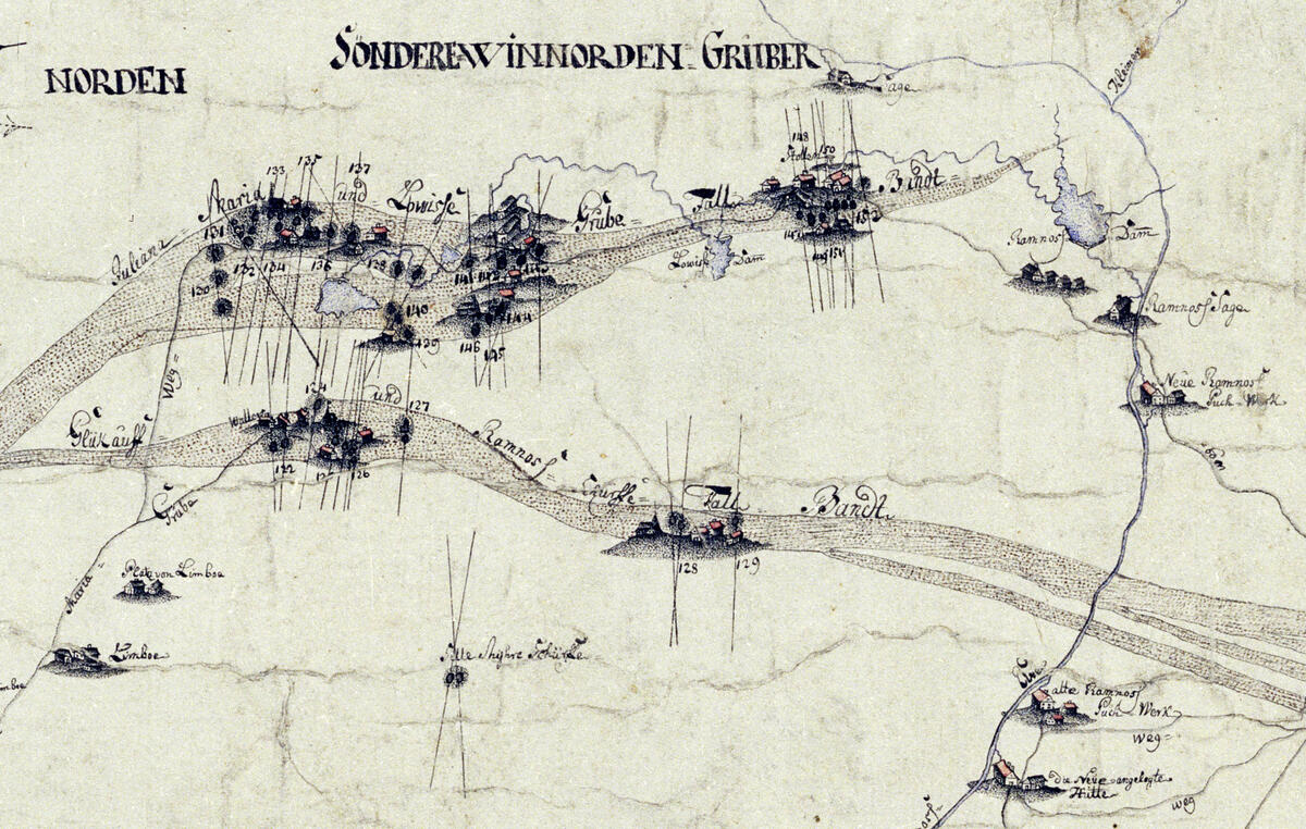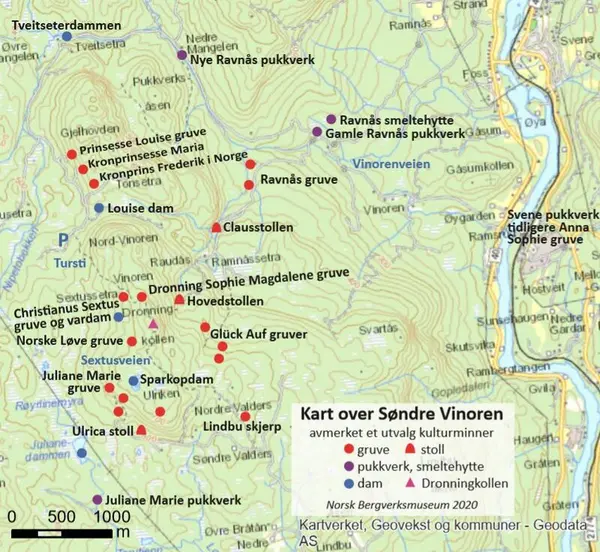 Kartutsnitt fra 1776 som viser gruvefeltet på Søndre Vinoren. Nede t.v. Lindbu gård, nede t.h. smeltehytta og Gamle Ravnås pukkverk, lenger opp langs Pukkverkselva Nye Ravnås pukkverk, Ravnås sag og dam (Tveitseterdammen). I det største gruvefeltet, langs det såkalte Juliane Marie og Louise gruve fahlbånd, ses fra venstre Juliane-gruvene, Sparkop dam, vardammen ved Christianus Sextus gruve, gruvene på Dronningkollen, Louise dam og Prinsesse Louise med nabogruver. (J.G. Madelung, Norsk Bergverksmuseum KS II A VIII 49)