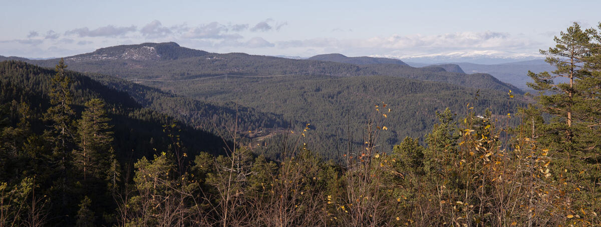 Utsikt fra Dronning Sophie Magdalene gruve (720 moh.) ned mot Svene pukkverk (200 moh.), anlagt i Flesbergs første betydelige sølvgruve, Anna Sophie gruve, funnet i 1722 av husmannen Tron Olson Trollerud. - 14/18