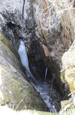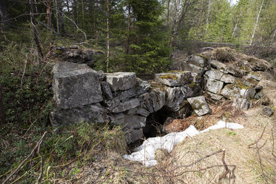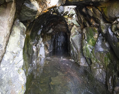 Vannutløpet av kunsthjulstua ved Christianus Sextus gruve (1740-tallet) går gjennom en sprengt skjæring. - 11/18