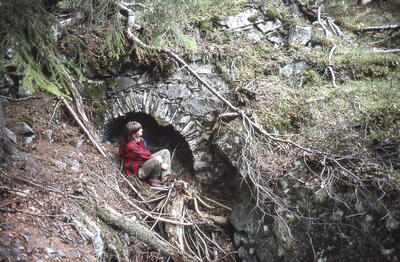 Lokstallen ved Clausstollen sto ennå i 1970-årene, da bildet ble tatt, men er nå borte. Clausstollen ble drevet med bormaskiner av det tyskeide Trollerud Sølvverk A/S 1912–1918 og er 2,1 km lang. Den ligger ca. 165 m lavere enn Hovedstollen og når gruvene i omkring 300 meters dybde. Stollen har vært hovedatkomst for Sølvverkets drift 1941–1956 og for senere privat småskaladrift etter sølvstuffer. - 17/18