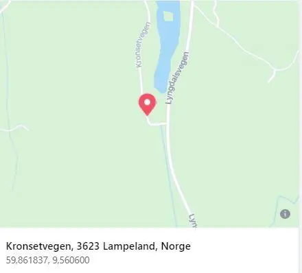 Oppmøte og parkering: Se bilde nedenfor. Ta av til venstre fra Lyngdalsveien og kjør inn på Kronsetvegen (grusvei). Kjør over den lille brua over bekken og noen titalls meter innover. Parker i veikanten. OBS: Ikke sperr for annen trafikk.