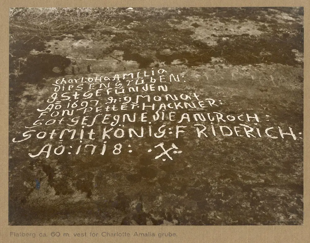 En inskripsjon ved Charlotta Amalia gruve nevner funnet i 1697 og finneren Petter Hackner. (Foto: Henning Tønsberg ca. 1930)