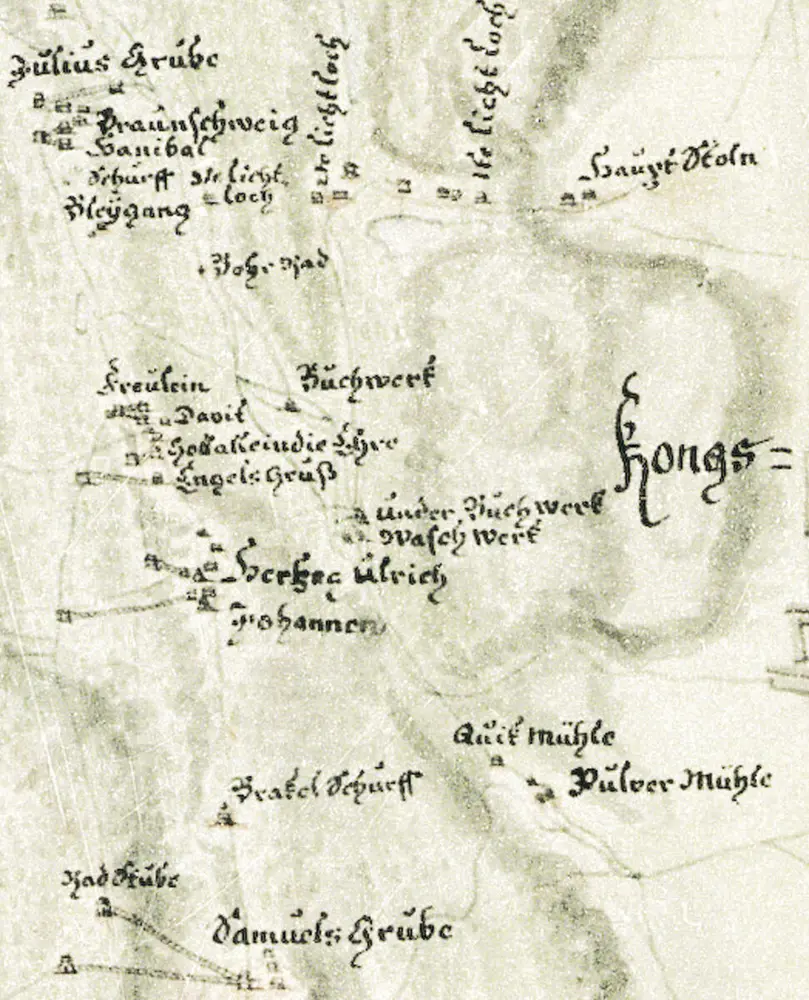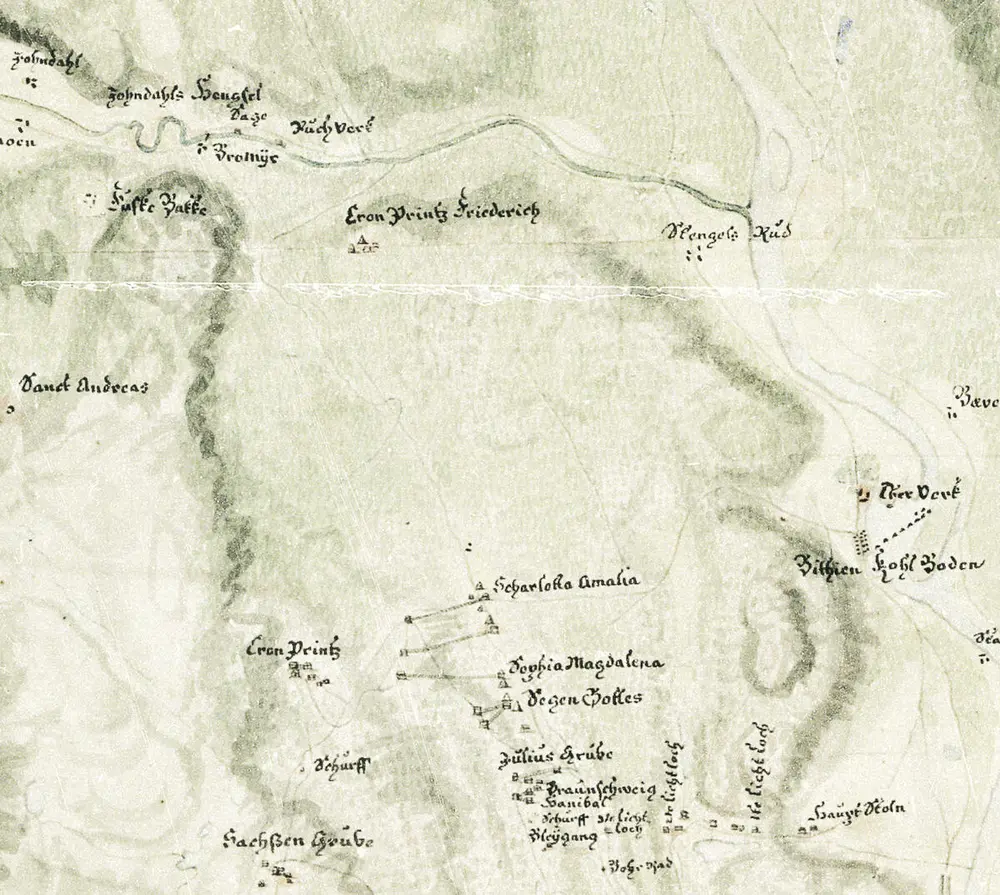 Utsnitt av kart fra 1746 som viser området Funkelia–Storåsen med pukkverkene langs Pukkverkselva og turstrekningen forbi borhjulet («Bohr-Rad») ved Hannibal gamle hjulstue, Underbergstollen («Haupt Stoln») med sine tre lichtloch, Underbergets gruver fra Samuel til Juels («Julius Grube»). Nede t.h. kruttmølla («Pulver Mühle») og kvikkmølla, et privat anlegg for amalgamasjon med kvikksølv av sølv fra avgangshauger. (P.F. von Langen, Norsk Bergverksmuseum KS II A VIII 28)