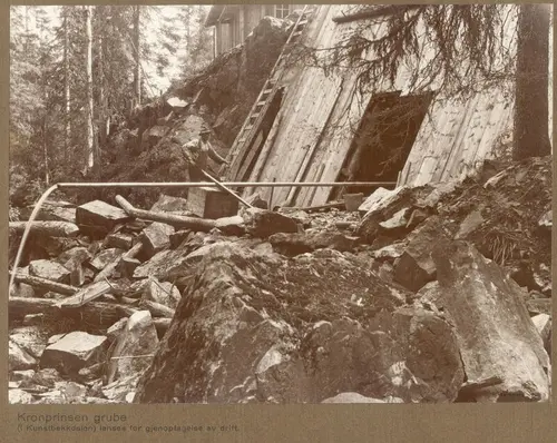Kronprinsens gruve ble lenset for å forberede gjennomslaget med Christian 7. stoll. Lensingen skjedde via dette sideskjerpet i Kunstbekkdalen. Henning Tønsberg tok bildet under arbeidet i 1933 (Norsk Bergverksmuseum).