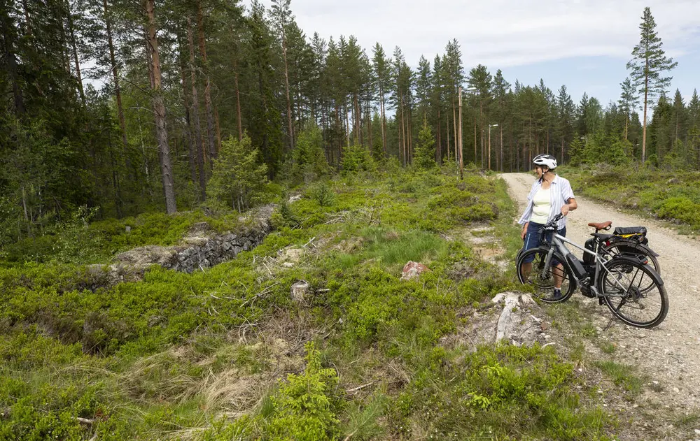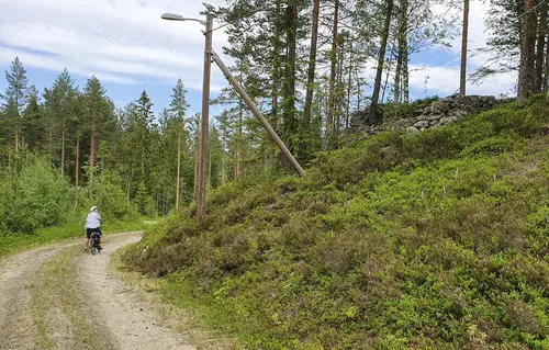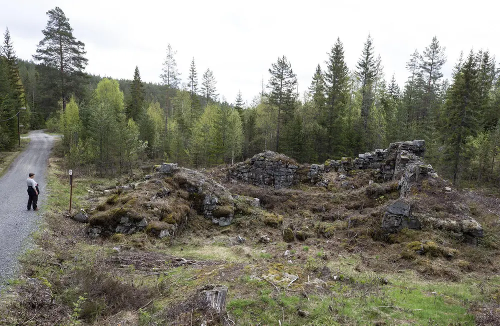 Renna til den sanerte hjulstua ved Svarte Torstein ses fra veien et stykke over gruva (13).