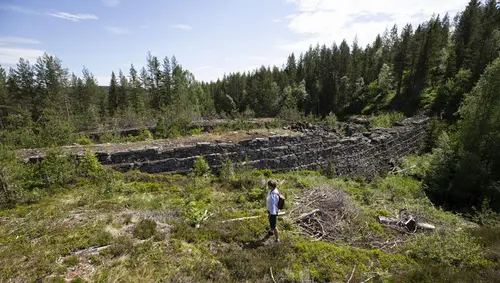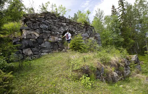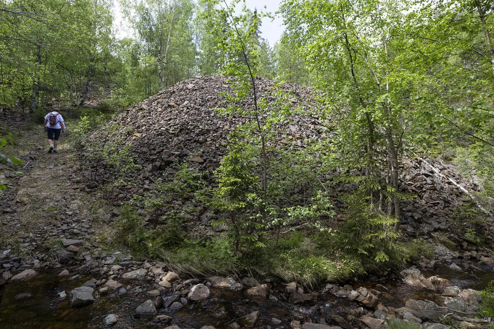 Etter to bekkekryssinger går stien opp til Kronprinsens gruve (11) mellom berghaldene.