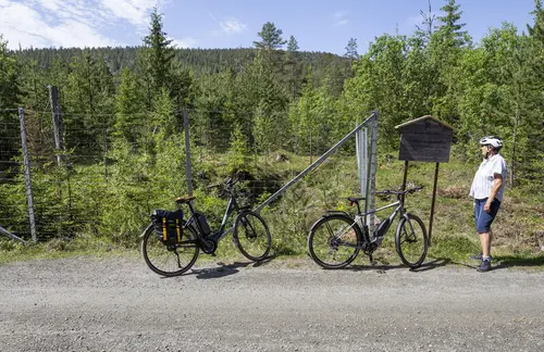 Fra (6) videre langs veien mot Kunstbekken der lysløypa krysses igjen (hvilebenk). (I dette området er veien dekket med grov grus som gir noe risting på sykkelen.) I et veikryss (8) tas en avstikker t.v. inn til der veien stopper ved Kunstbekken (9). Her kan sykkelen parkeres mens man tar et par avstikkere til fots.