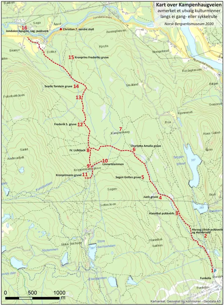 Kampenhaugveien går fra Funkelia til Jondalen og passerer bergverksminner langs nordre deler av gruvefeltene Underberget og Overberget. Skogsveien, som er stengt med bom, passer for gang- og sykkelturer (noe grov grus).