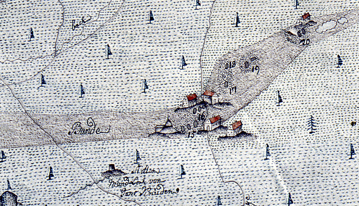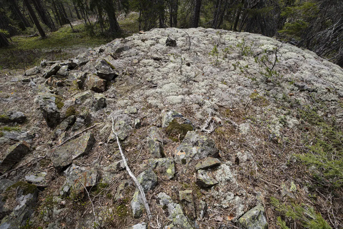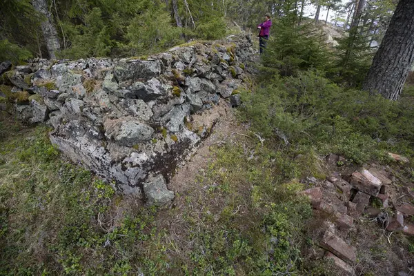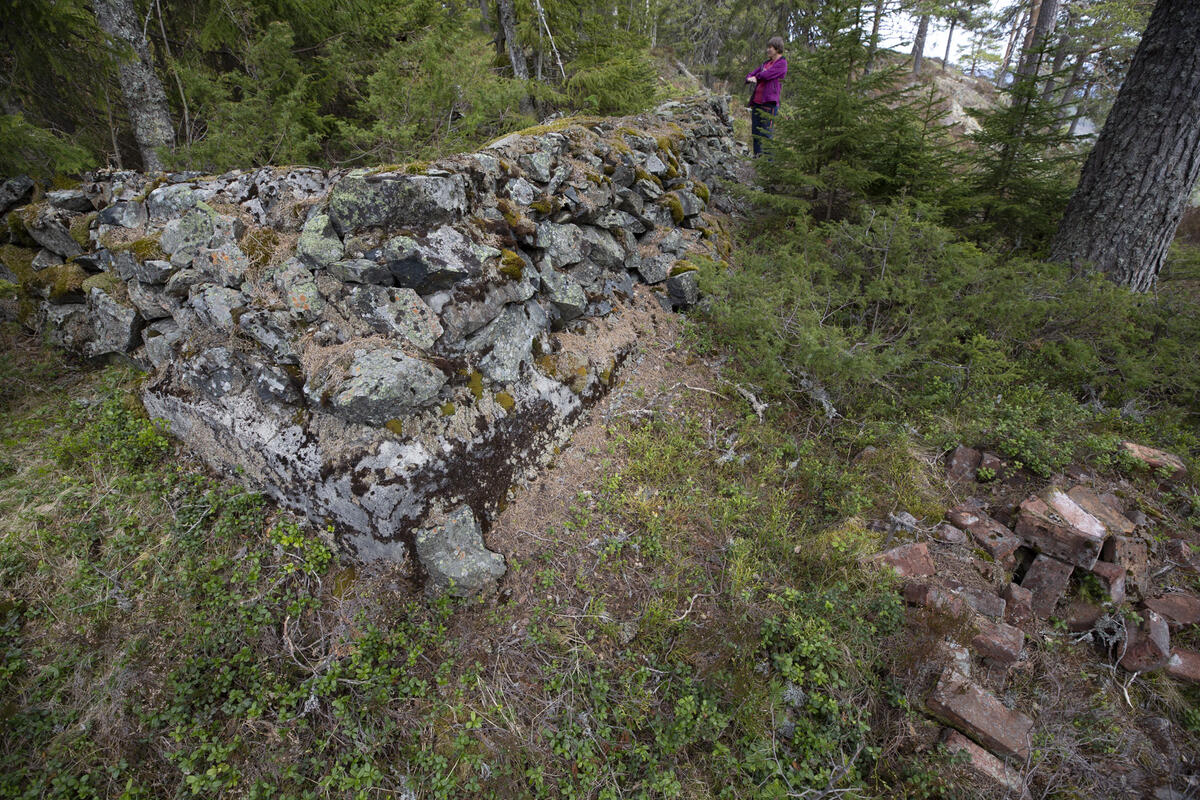 Grunnmur etter en større bygning, muligens sakkerhuset, i nordkanten av det største gruvefeltet. Like nedenfor – t.v. for bildet – er et vannhull som kan tolkes som sakkerhusets brønn.