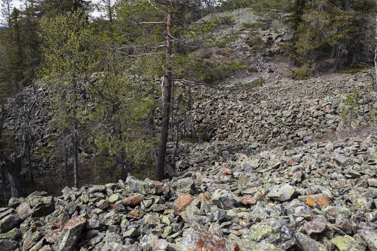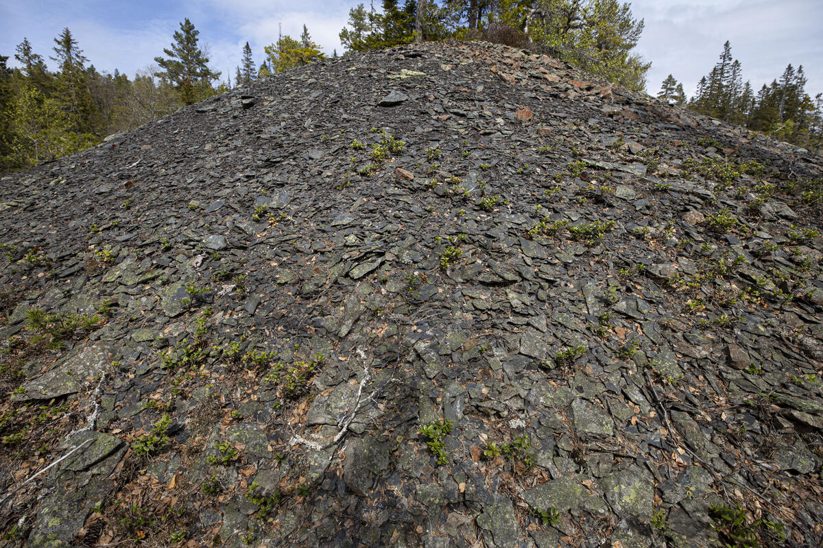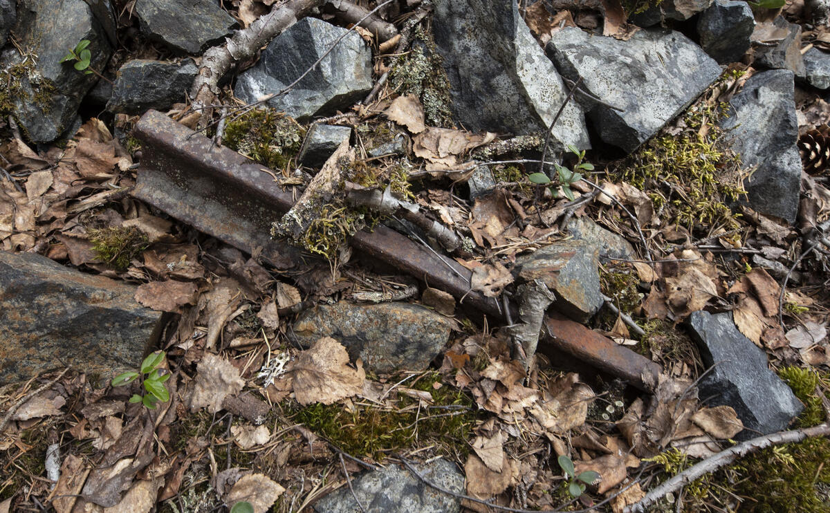 En skinnebit i berghalden utenfor stollen minner om den moderne tids drift. Den og andre kulturminner etter gruvedriften ved Knutehåvet er fredet og skal få ligge.