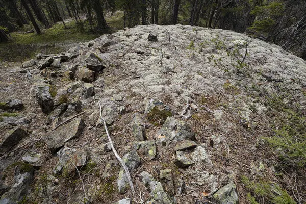 Utsikt vestover mot Meheia over berghaldslandskapet i gruvefeltet ved Knutehåvet; skjerp Nr. 6 fremst i bildet.