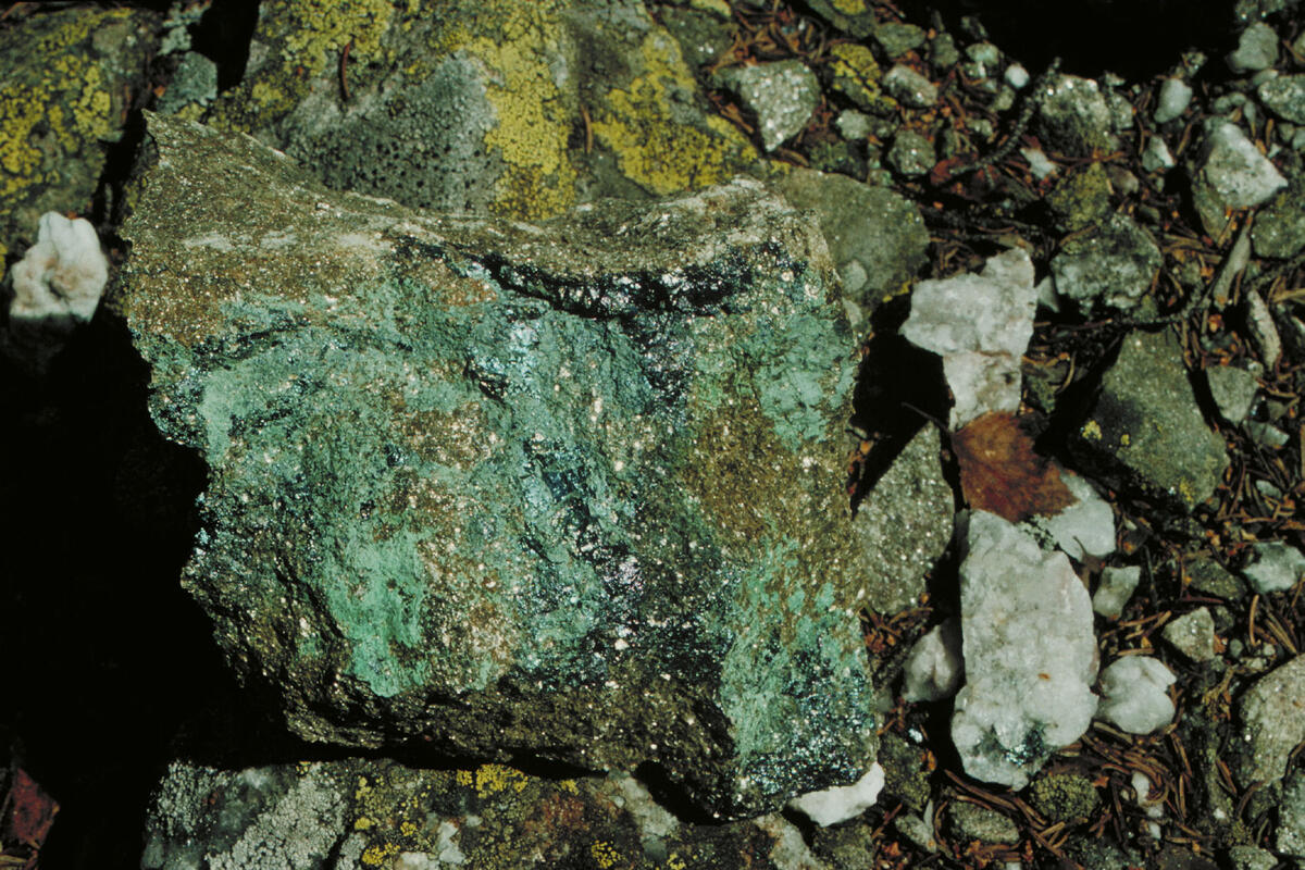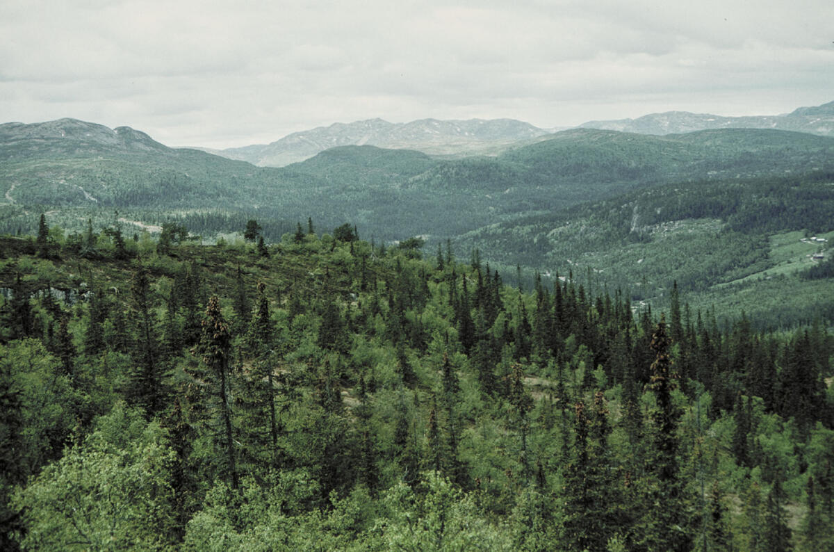 Fjellgardane i Fyresdal, utsikt vestover fra Mosnap mot Moisesberg gruvefelt og Øysteinsfjell t.v. Grusen gruve – den antatte Påskelammet gruve – ligger i nedkant av Øysteinsfjell, på nordsiden, 800 m.o.h. Smeltehytta lå nede i dalen, omtrent midt i bildet, under Aslestad gård. B.I. Berg/Norsk Bergverksmuseum