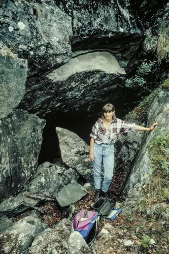 Den rasfarlige inngangen til Grusen gruve, som går skrått nedover i fjellet (foto 1989). B.I. Berg/Norsk Bergverksmuseum
