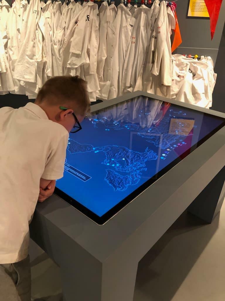 Resten av lørdagen gikk med til besøk på Bergverksmuseet der familien blant annet fikk se verdens største utstilling av trådsølv, prøve seg på spennende aktiviteter på museets Geolab, og litt sightseeing i Kongsberg.