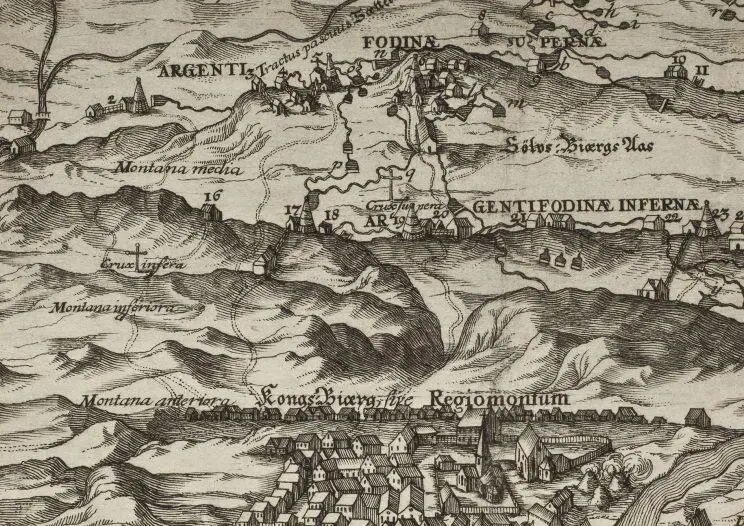 Utdrag fra J.F. Nortmanns bok om Sølvverket fra 1631, etter beskrivelsen av Overbergets gruver, i oversettelse: «Nå vil vi fare ned til Underberget, og omtrent halvveis til Kongsberg kommer vi til det nedre korset, hvorfra veien går nordover. Der, på venstre hånd eller mot vest fra veien, befinner det seg ei ny gruve, som Samuel Loss påviste 14. oktober 1630, omtrent fire dager før sin død.» – Videre beskrives forekomsten.