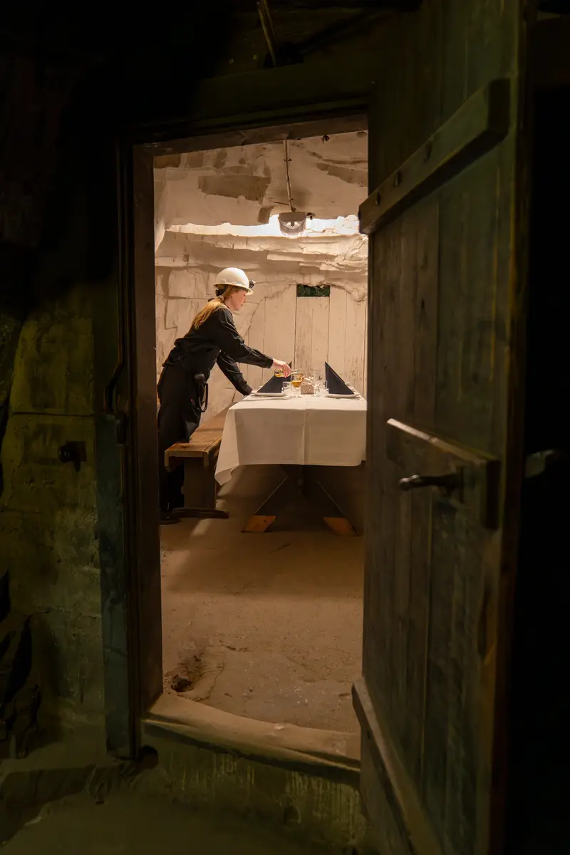 Et selskap i Oppholdet skaper en intim atmosfære med historisk sus fra tiden arbeiderne brukte rommet til å hvile og spise sin nistemat 342 meter under bakken.