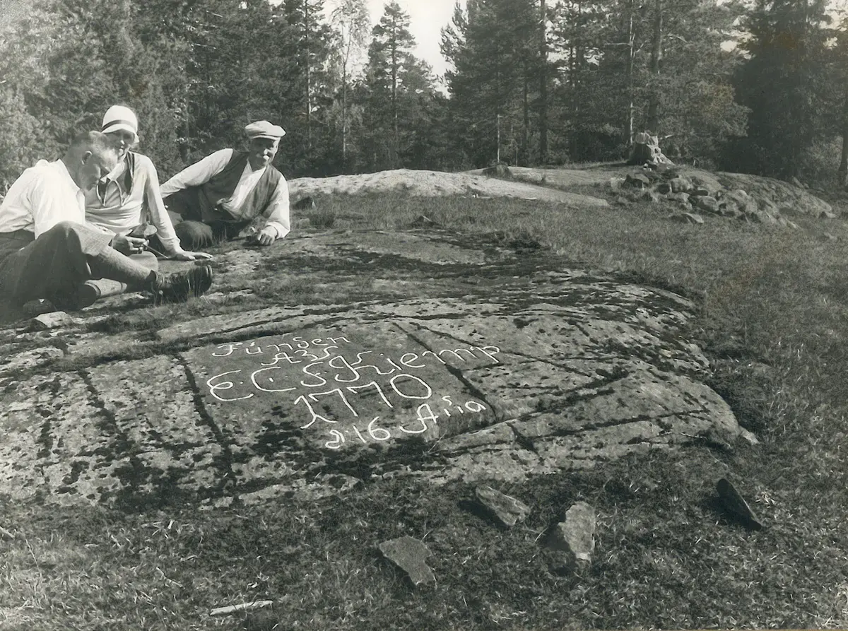Skjerperen Ener Caspersen Kiemps inskripsjon om funnet, med datoen 16. august 1770, da driften ble igangsatt – sølvfunnet var gjort året før. Soluret ligger på svaberget lengst bak i bildet. (Foto: Henning Tønsberg ca. 1930, Norsk Bergverksmuseum)