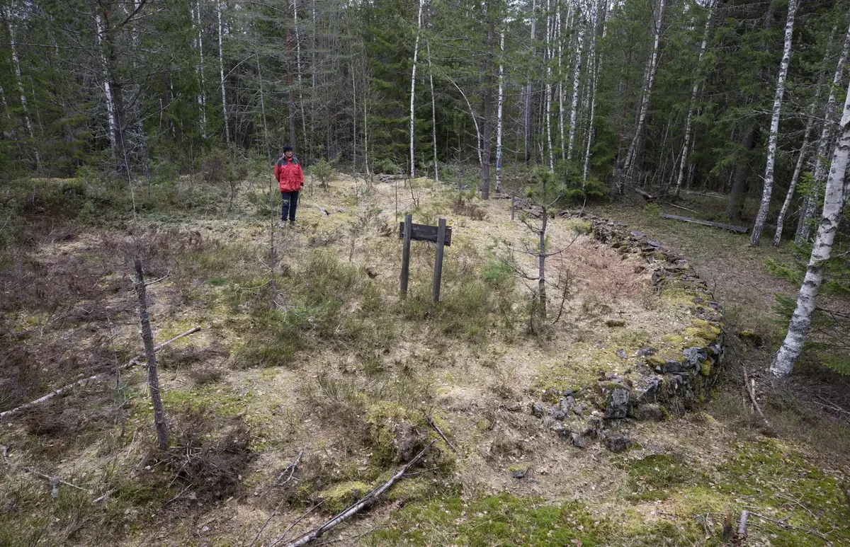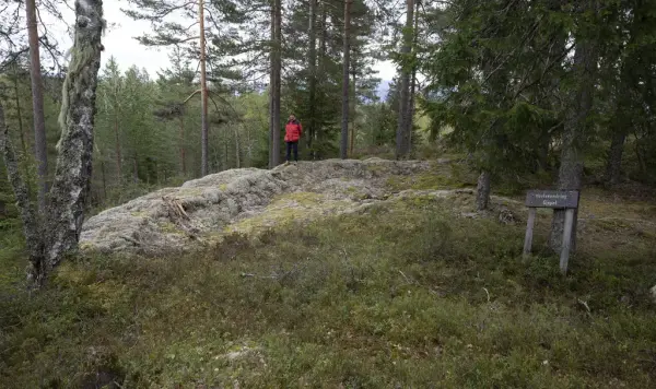 Tuft for hestegjøpel ved Nr. 9 med oppmuring i ytterkant. Skiltet står omtrent i sentrum av den sirkulære tomta, der den loddrette akselen med heisekjettingene sto. B.I.Berg/ Norsk Bergverksmuseum
