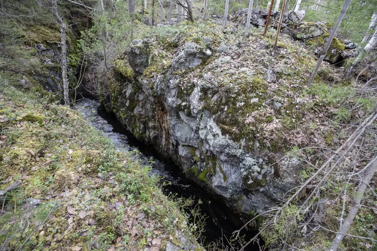 Berghald ved Skara Ertzdyb gruve, stein med borhull. B.I. Berg/Norsk Bergverksmuseum